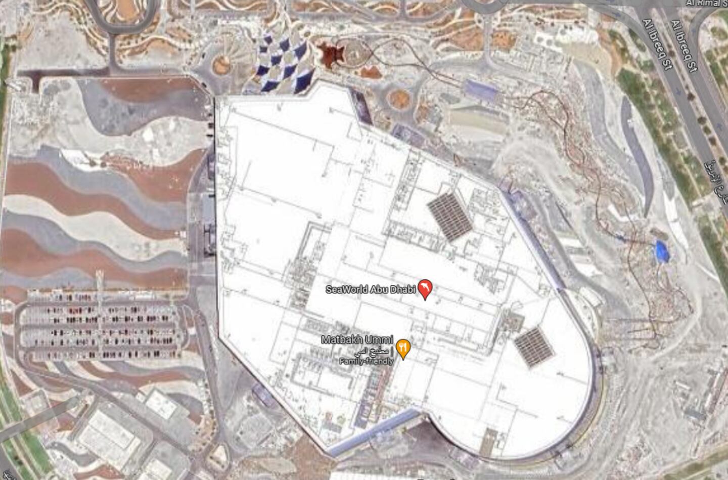 In another absolutely astounding feat of engineering in the Dubai area, the newest SeaWorld branded park is almost completely an indoors experience, yes even with the rides. One of the roller coasters does extend outside the main building, but I think you still get on and off inside the enormous building. This new park is also essentially across the street from Ferrari World, so most of what’s called Yas Island is just a giant playground. Check out how big the building is. The red squiggly line on the right is the coaster that stretches outdoors too. (This is clearly taken before the park was finished.)