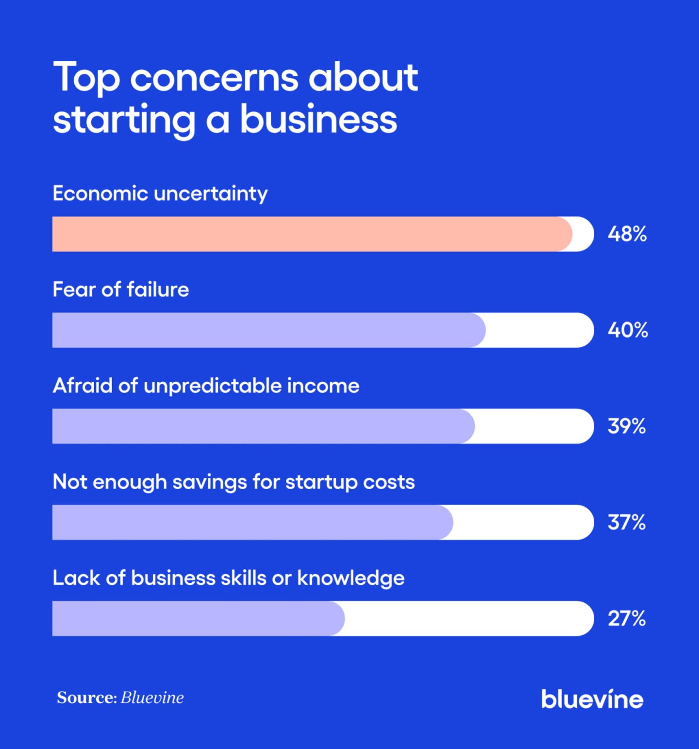 Nearly half of the would-be business founders surveyed listed “economic uncertainty” in their top three concerns for starting a business (47.9%), ahead of fear of failure (40%) and unpredictable income (38.5%).