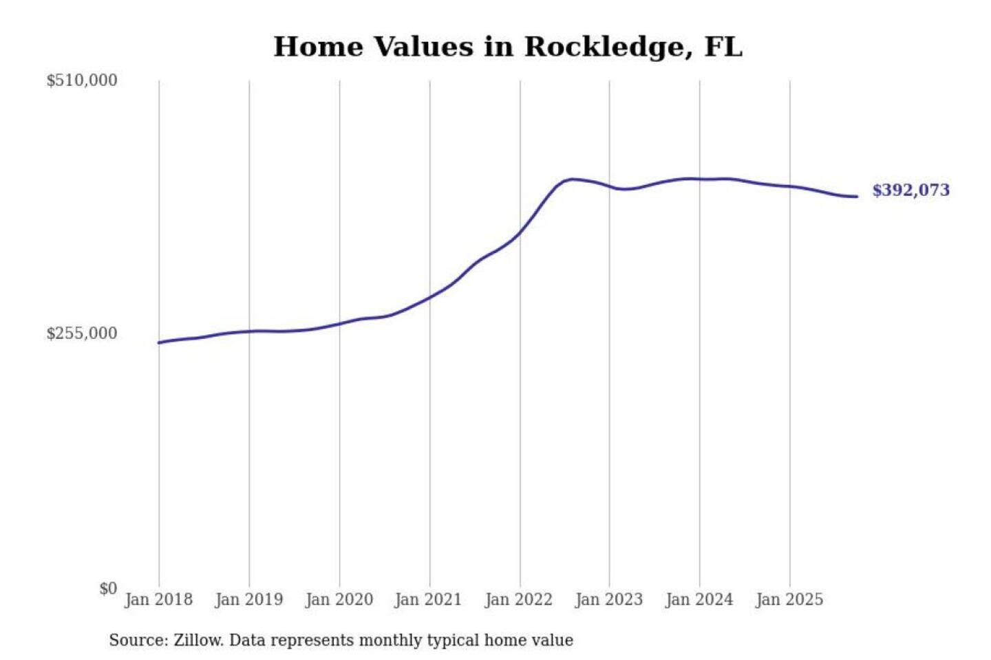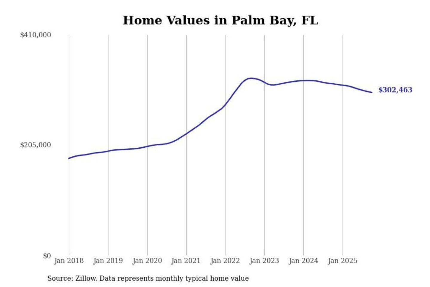 Stacker compiled a list of cities with the most expensive homes in the Palm Bay-Melbourne-Titusville, FL metro area using data from Zillow. Charts show the monthly typical home value since January 2018.