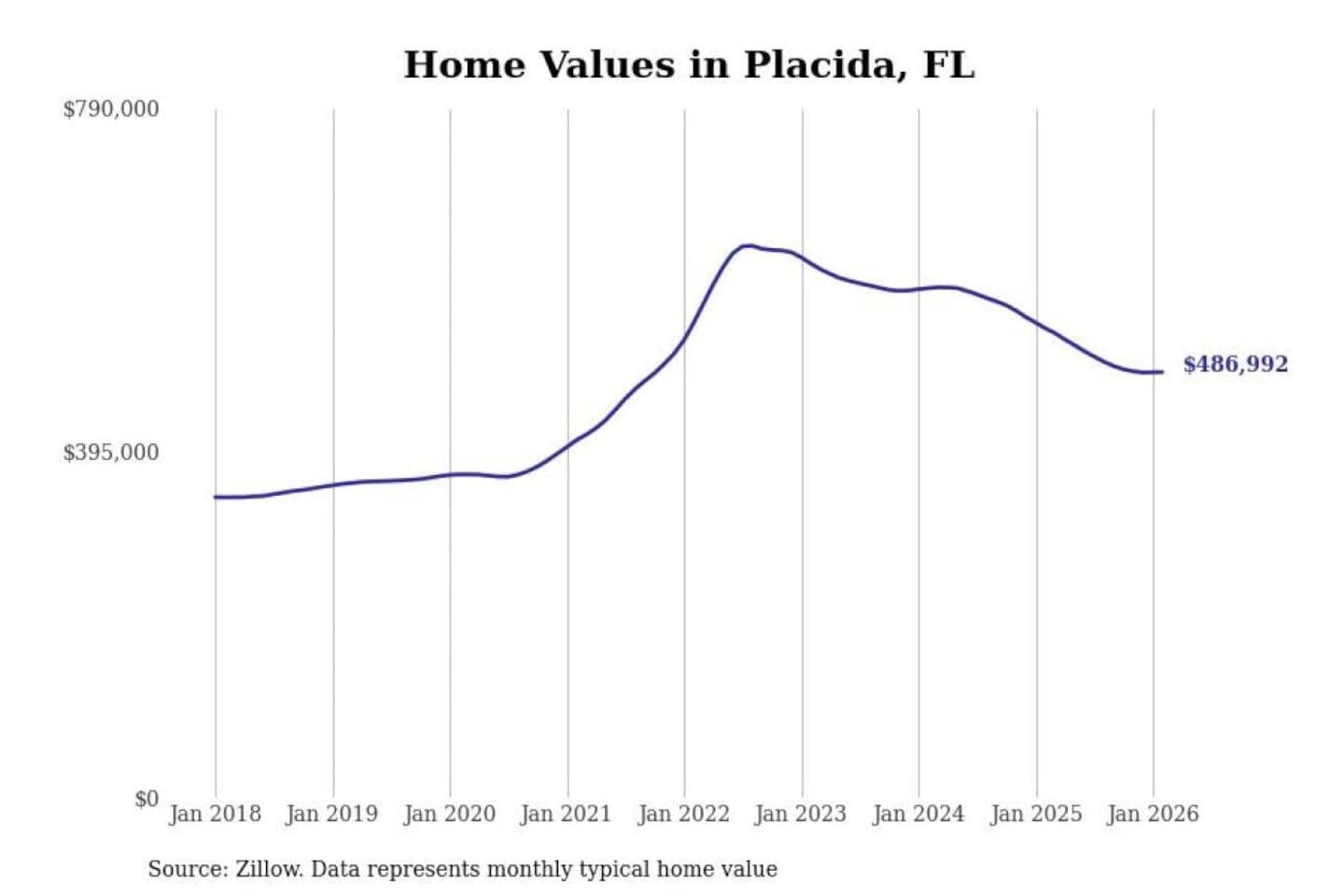 Stacker compiled a list of cities with the most expensive homes in the Punta Gorda, FL metro area using data from Zillow. Charts show the monthly typical home value since January 2018.