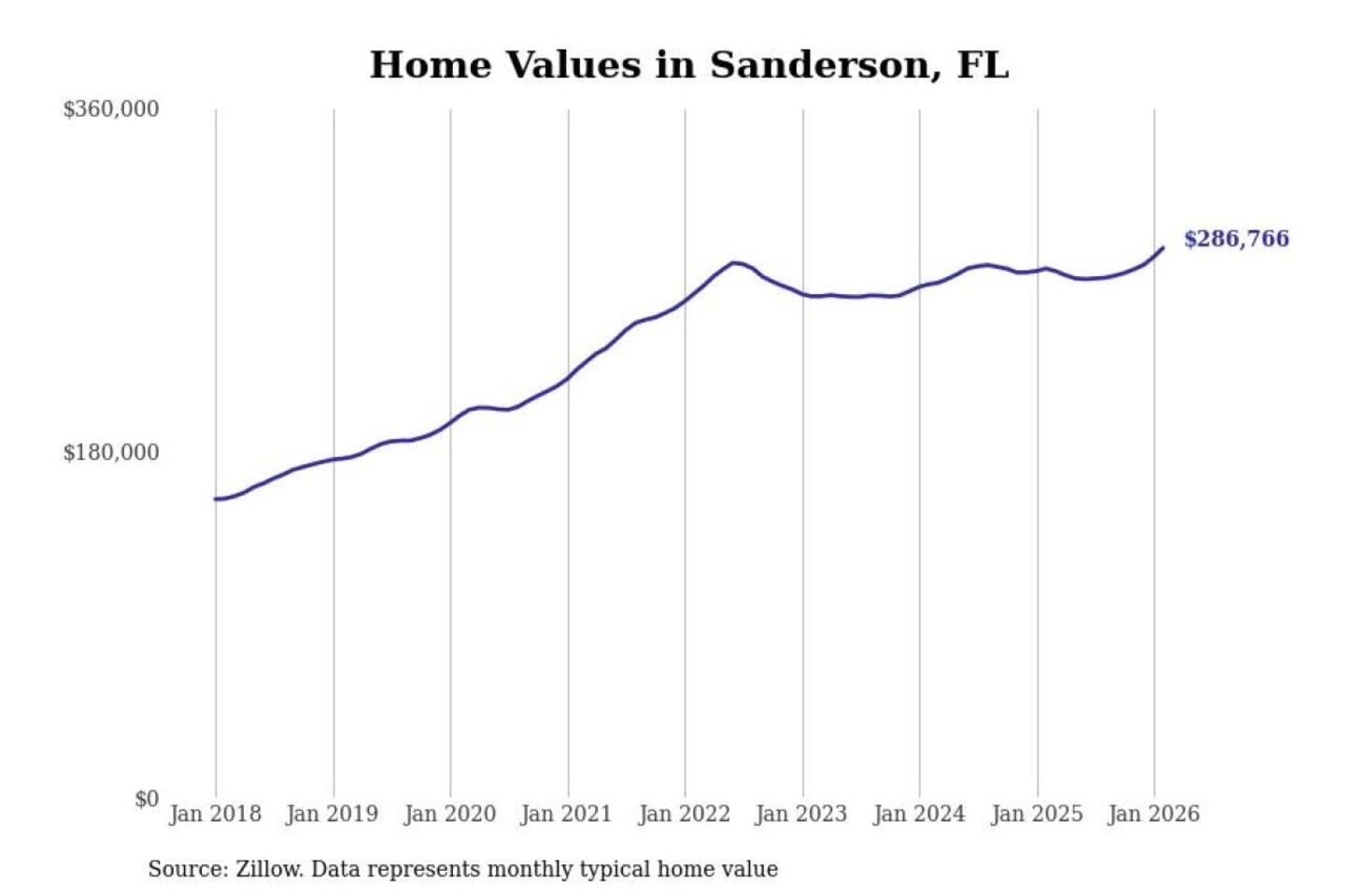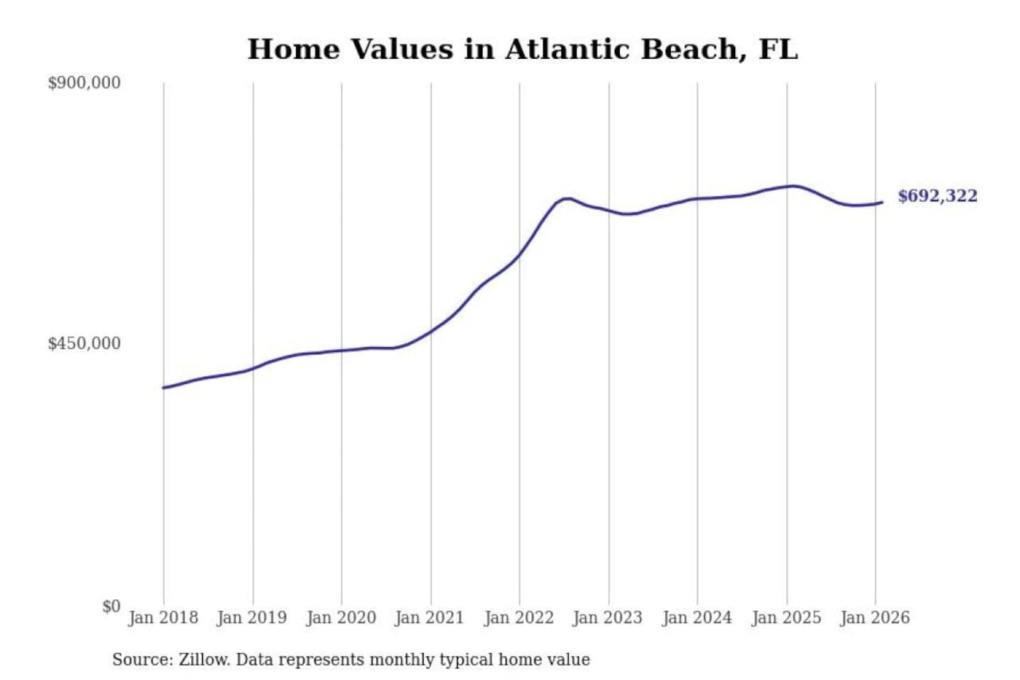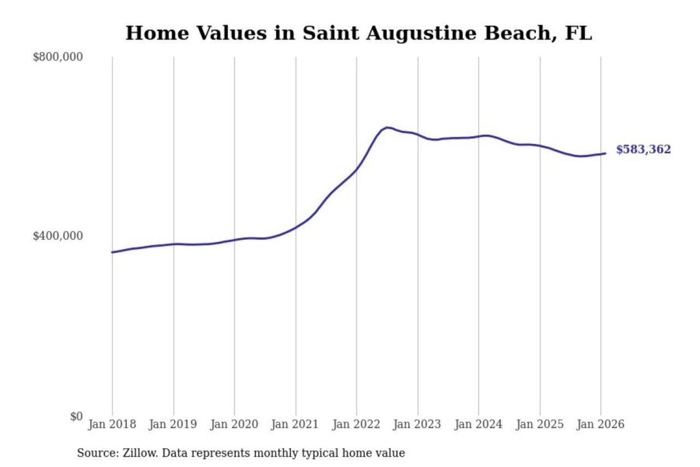 Stacker compiled a list of cities with the most expensive homes in the Jacksonville, FL metro area using data from Zillow. Charts show the monthly typical home value since January 2018.