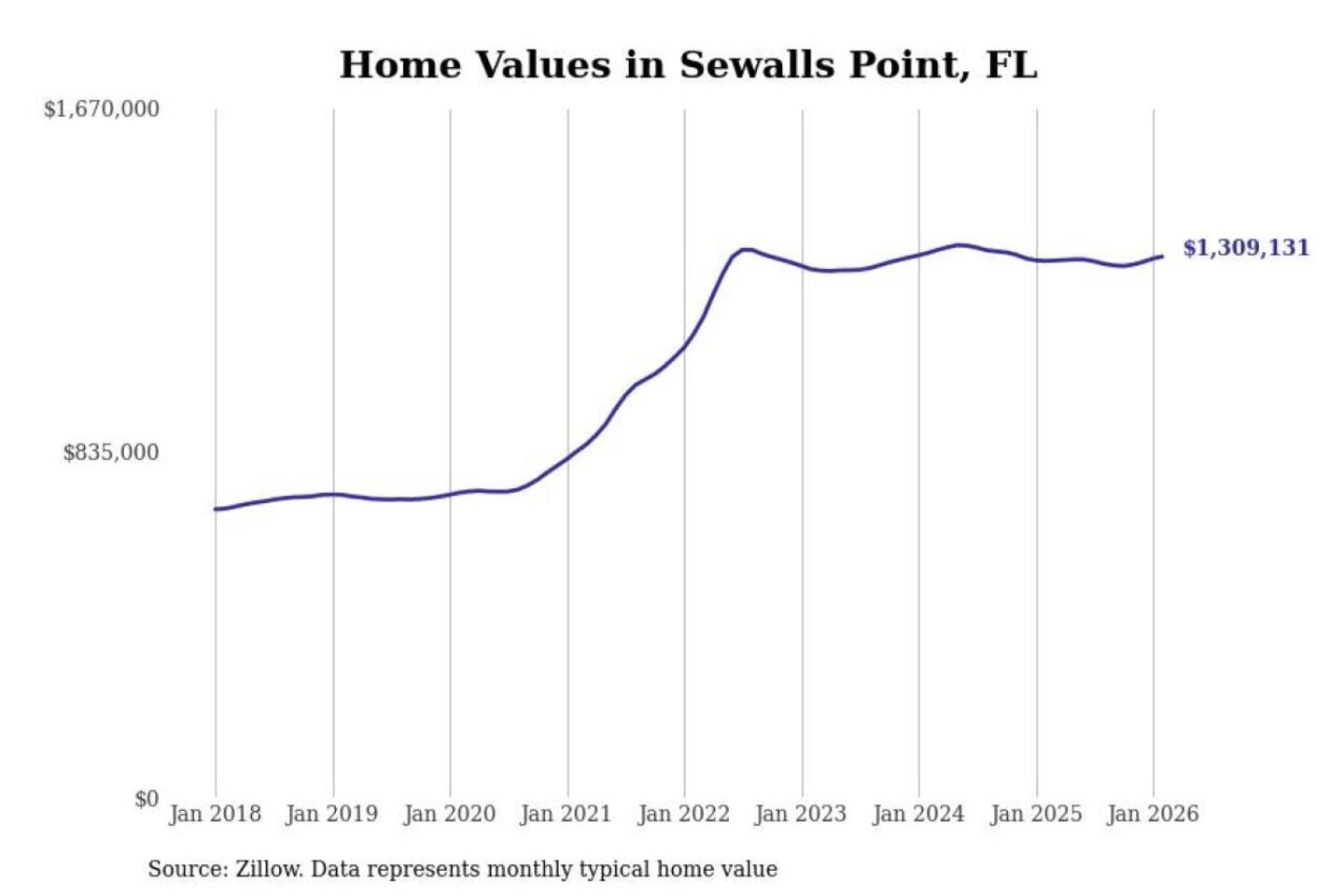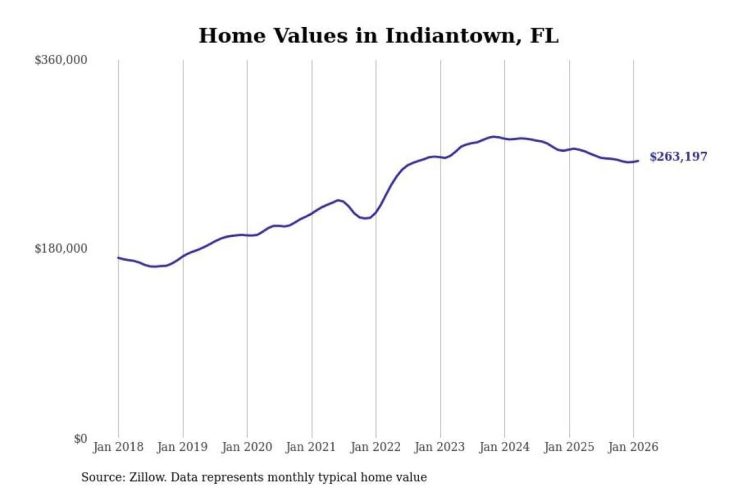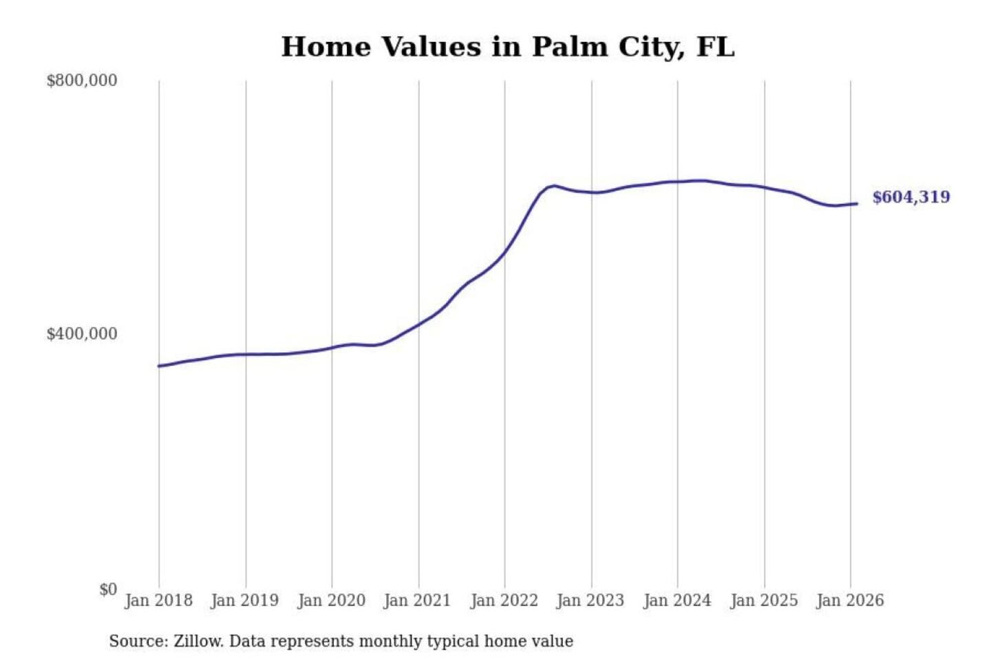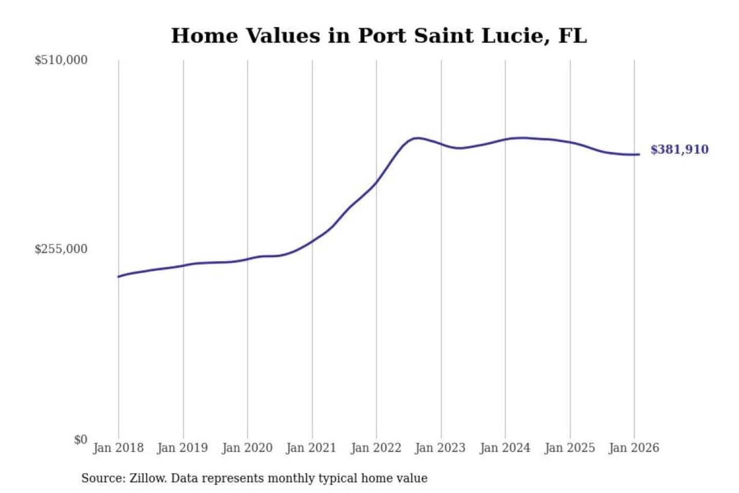 Stacker compiled a list of cities with the most expensive homes in the Port St. Lucie, FL metro area using data from Zillow. Charts show the monthly typical home value since January 2018.