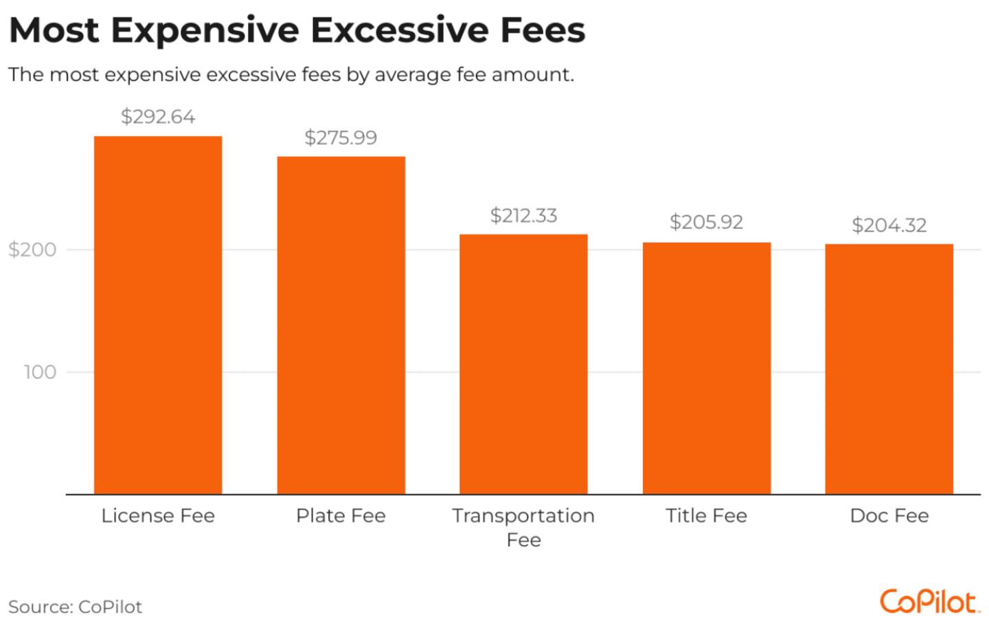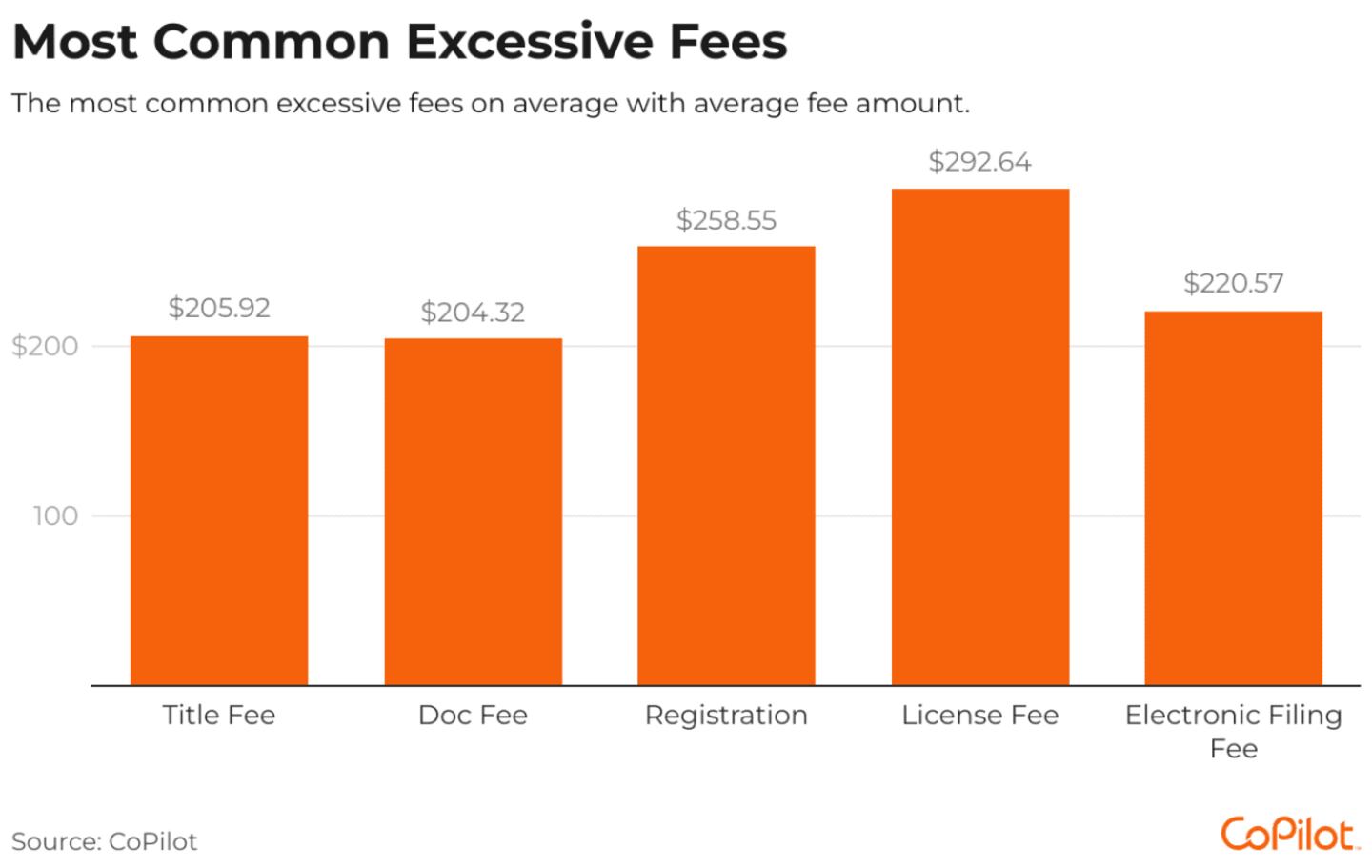 • The amount in license fees that dealers are allowed to charge is capped by the state and should not exceed a certain amount. This number is the average amount by which license fees exceeded the state limit in the used car purchases analyzed by CoPilot.