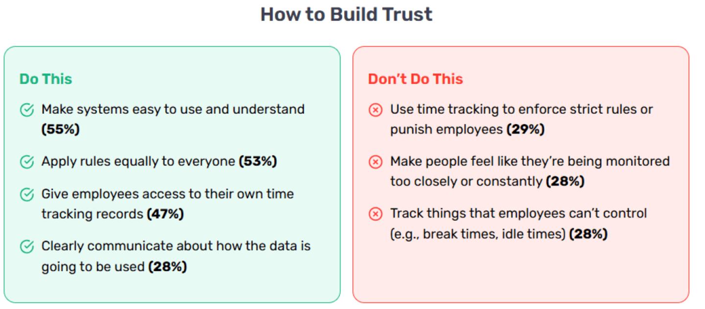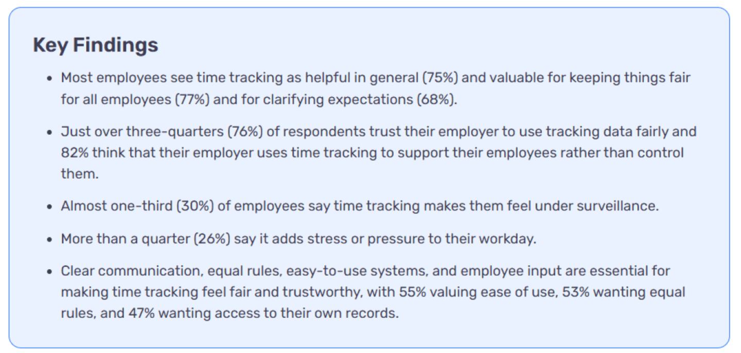 These stakes make clear communication and thoughtful design more important than ever. Buddy Punch's 2025 survey of over 500 non-managerial U.S. workers reveals a complex reality: Most employees see time tracking as helpful for ensuring accurate pay and clear expectations, but many also view it as surveillance or a source of stress and confusion, especially when systems are poorly communicated or designed.