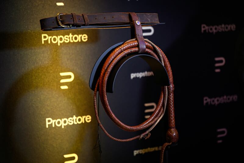 Propstore auction LONDON, ENGLAND - AUGUST 06: The belt and bullwhip (estimated sale price of $250,000-500,000) used by the character Indiana Jones in "Indiana Jones and Last Crusade" is displayed at a photocall ahead of an auction of entertainment memorabilia by Propstore, on August 06, 2025 in London, England. The bullwhip is among several iconic film memorabilia that will be going to auction in Los Angeles in September, alongside the screen-matched lightsaber prop, used by the character "Darth Vader" in the Star Wars films "The Empire Strikes Back and "Return Of The Jedi",' and Sauron's Helmet from, 'The Lord of the Rings.' (Photo by Leon Neal/Getty Images) (Leon Neal/Getty Images)