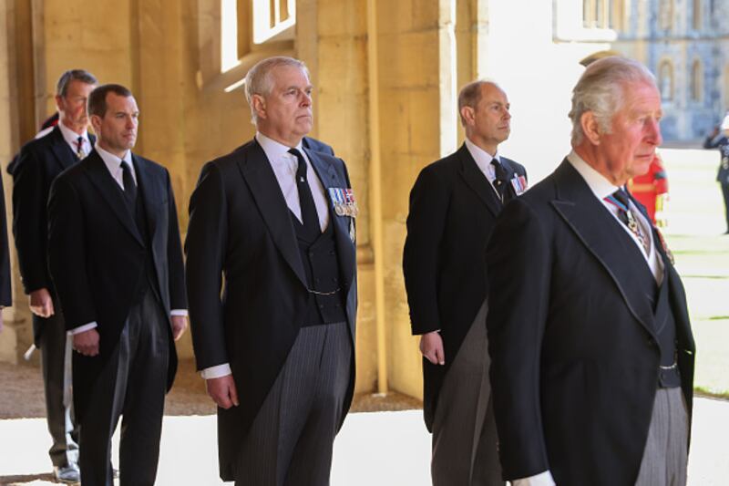 Through the years Prince Andrew, Duke of York; Prince Harry, Duke of Sussex; Prince William, Duke of Cambridge and Vice-Admiral Sir Timothy Laurence walk behind The Duke of Edinburgh’s coffin, covered with His Royal Highness’s Personal Standard, during the Ceremonial Procession during the funeral of Prince Philip, Duke of Edinburgh at Windsor Castle on April 17, 2021 in Windsor, England. Prince Philip of Greece and Denmark was born 10 June 1921, in Greece. He served in the British Royal Navy and fought in WWII. He married the then Princess Elizabeth on 20 November 1947 and was created Duke of Edinburgh, Earl of Merioneth, and Baron Greenwich by King VI. He served as Prince Consort to Queen Elizabeth II until his death on April 9 2021, months short of his 100th birthday. His funeral takes place today at Windsor Castle with only 30 guests invited due to Coronavirus pandemic restrictions. (Photo by Mark Large-WPA Pool/Getty Images) (MARK LARGE/Getty Images)