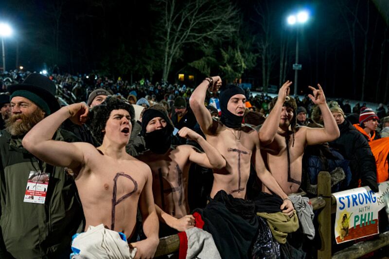 Groundhog Day PUNXSUTAWNEY, PA - FEBRUARY 02: Landon Cook, Aiden Cameron, Sawyer Hall and Matt Grusky cheer during a concert on February 2, 2023 in Punxsutawney, Pennsylvania. Groundhog Day is a popular tradition in the United States and Canada. A crowd of upwards of 10,000 people spent a night of revelry awaiting the sunrise and the groundhog's exit from his winter den. If Punxsutawney Phil sees his shadow, he regards it as an omen of six more weeks of bad weather and returns to his den. Early spring arrives if he does not see his shadow, causing Phil to remain above ground. (Photo by Michael Swensen/Getty Images) (Michael Swensen/Getty Images)