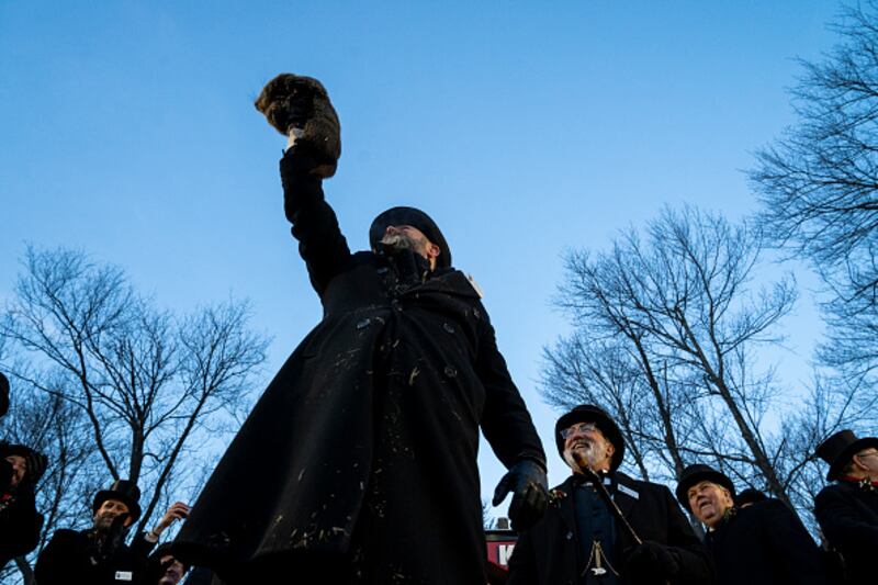 Punxsutawney Phil Looks For His Shadow In Annual Groundhog Day Tradition PUNXSUTAWNEY, PA - FEBRUARY 02: Groundhog handler AJ Derume holds Punxsutawney Phil, who saw his shadow, predicting a late spring during the 136th annual Groundhog Day festivities on February 2, 2023 in Punxsutawney, Pennsylvania. Groundhog Day is a popular tradition in the United States and Canada. A crowd of upwards of 5,000 people spent a night of revelry awaiting the sunrise and the groundhog's exit from his winter den. If Punxsutawney Phil sees his shadow he regards it as an omen of six more weeks of bad weather and returns to his den. Early spring arrives if he does not see his shadow, causing Phil to remain above ground. (Photo by Michael Swensen/Getty Images/Getty Images)