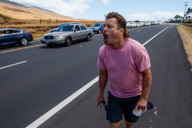 Hawaii fire: Tempers flared as residents waited in long lines as they are not allowed to pass a checkpoint to return to their homes in Lahaina. (Robert Gauthier/Los Angeles Times via Getty Imag)