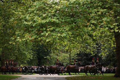 Photos: Queen Elizabeth II tributes continue across UK as royals, public grieve Horse-drawn gun crews arrive for a 96-gun salute at 1 p.m. in tribute to the late Queen Elizabeth II on September 9, 2022, in London. (Dan Kitwood/Getty Images)