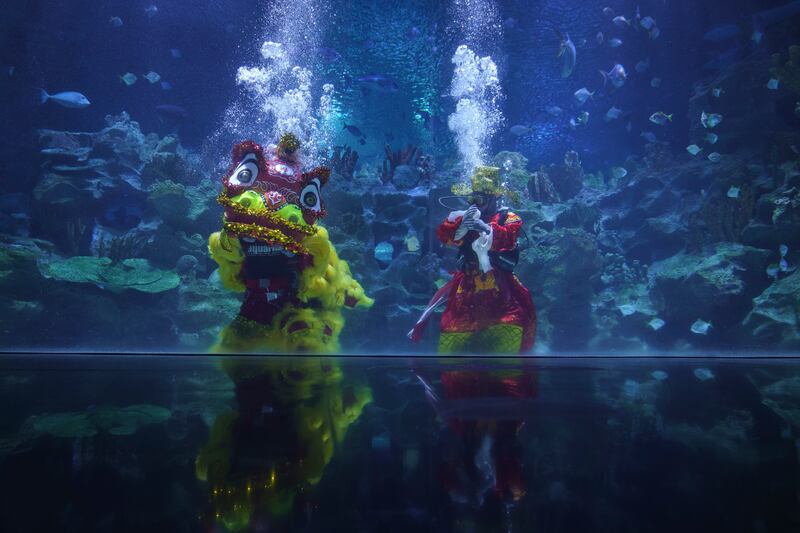 Lunar New Year celebrated around the world Divers perform an underwater lion dance at the KLCC Aquaria during Chinese Lunar New Year celebrations in Kuala Lumpur, Friday, Feb. 12, 2021. (AP Photo/Vincent Thian)
