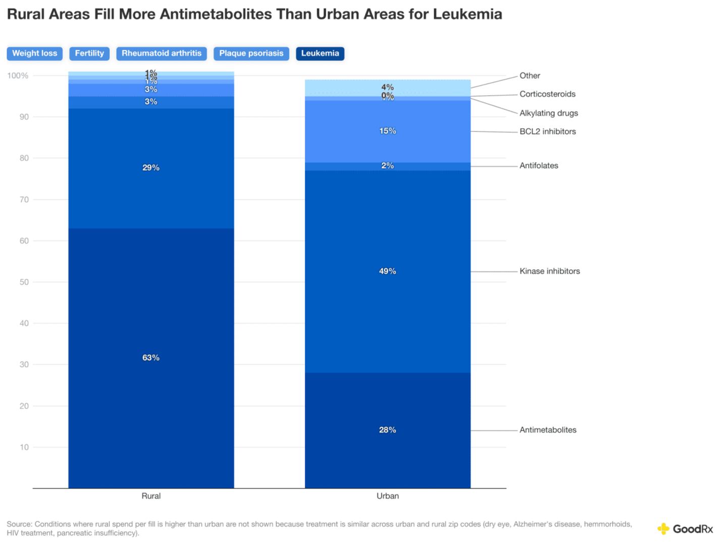 Antimetabolites are frequently used in oral maintenance therapy for leukemia. They can often be prescribed and managed in outpatient settings by nonspecialists or general oncologists, making them more accessible in rural areas. Antimetabolites are typically lower cost and generic, reducing both out-of-pocket costs and administrative hurdles. Urban areas are more likely to have access to specialty cancer centers, clinical trials, and novel targeted therapies, resulting in a greater percentage of fills for medications that are not antimetabolites.