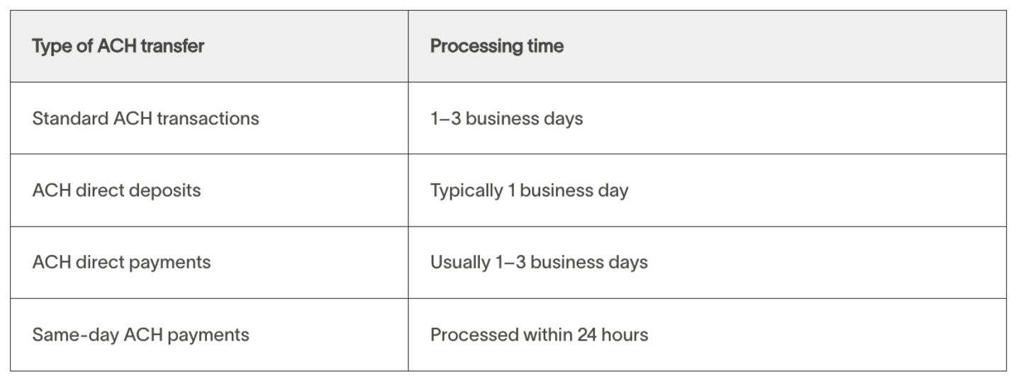 Most major U.S. banks and financial institutions support ACH transfers, but fees and processing times vary. For example, major U.S. banks and online-only banks typically process ACH payments within one to three business days. Some offer slightly faster processing, with most ACH transfers settling in one to two business days.